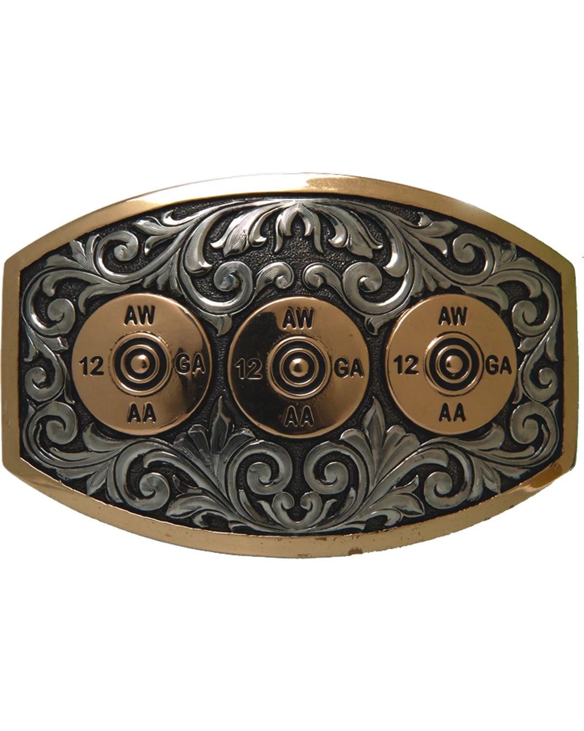 Complete your western look when you pull on this belt buckle from AndWest. This buckle has bronze coloring and vintage silver filigree that will make this piece really stand out. The middle features shotgun shell accents that will make this one of your go-to favorites. You can wear this AndWest buckle with any pair of jeans and belt.