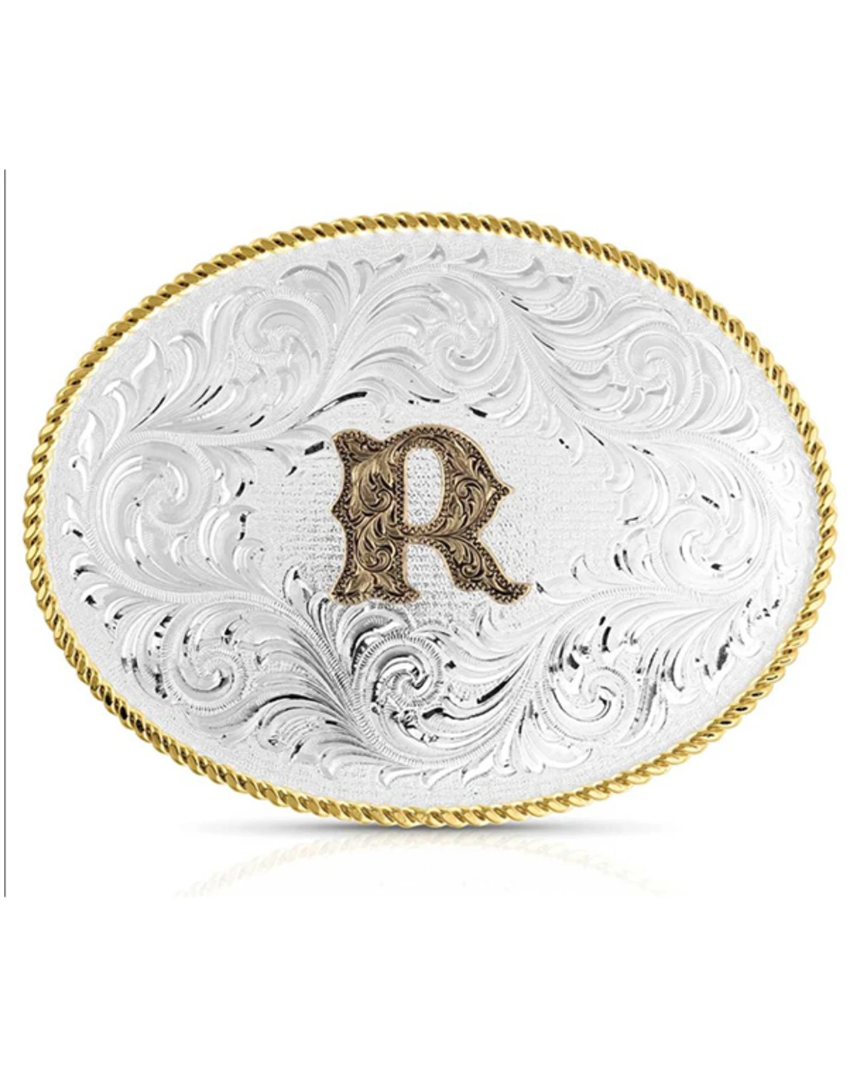 - Silver-toned oval buckle with gold roped border and “R” on front with silver-toned filigree details