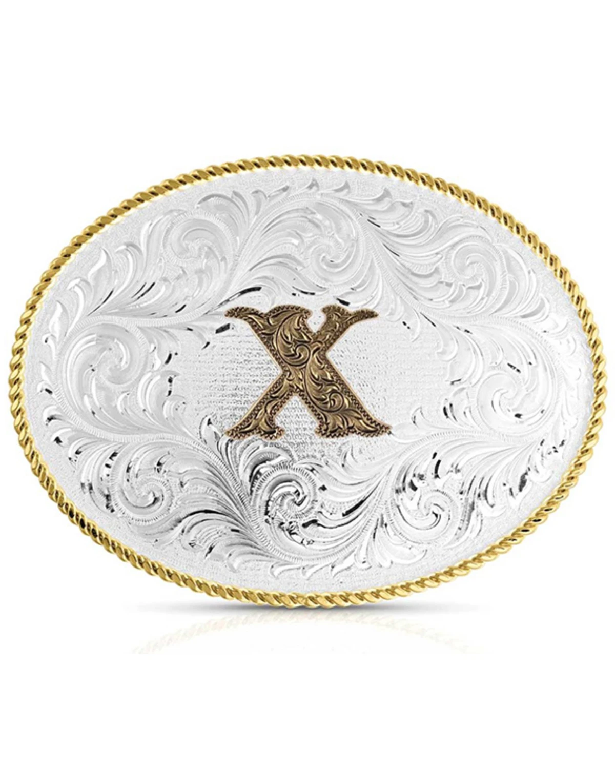 - Silver-toned oval buckle with gold roped border and “X” on front with silver-toned filigree details