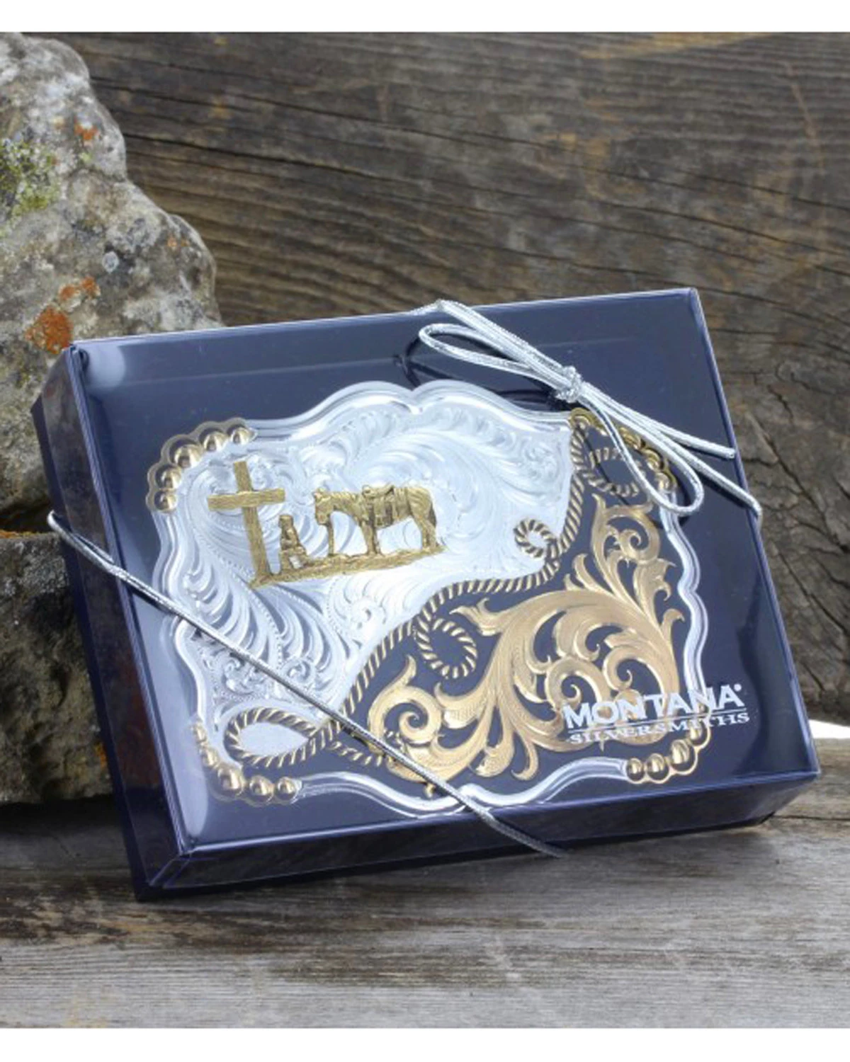 Never compromise on style when you pull on this buckle from Montana Silversmiths. This buckle features a unique half-n-half design, one side features the classic Christian cowboy and the other half shows traditional western scrolling in a gold finish. The scalloped edges will look great with any pair of jeans, slacks, or khakis in your closet. Spice up your formal, western look when you pull on this buckle from Montana Silversmiths.
